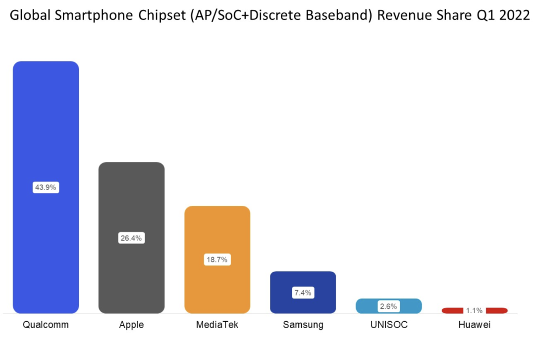 - 海思:受美国交易禁令的影响,华为无法制作出海思麒麟芯片。麒麟SoC的累积库存行将耗尽。全体收入从2021年Q1的8%下降到2022年Q1的1%。