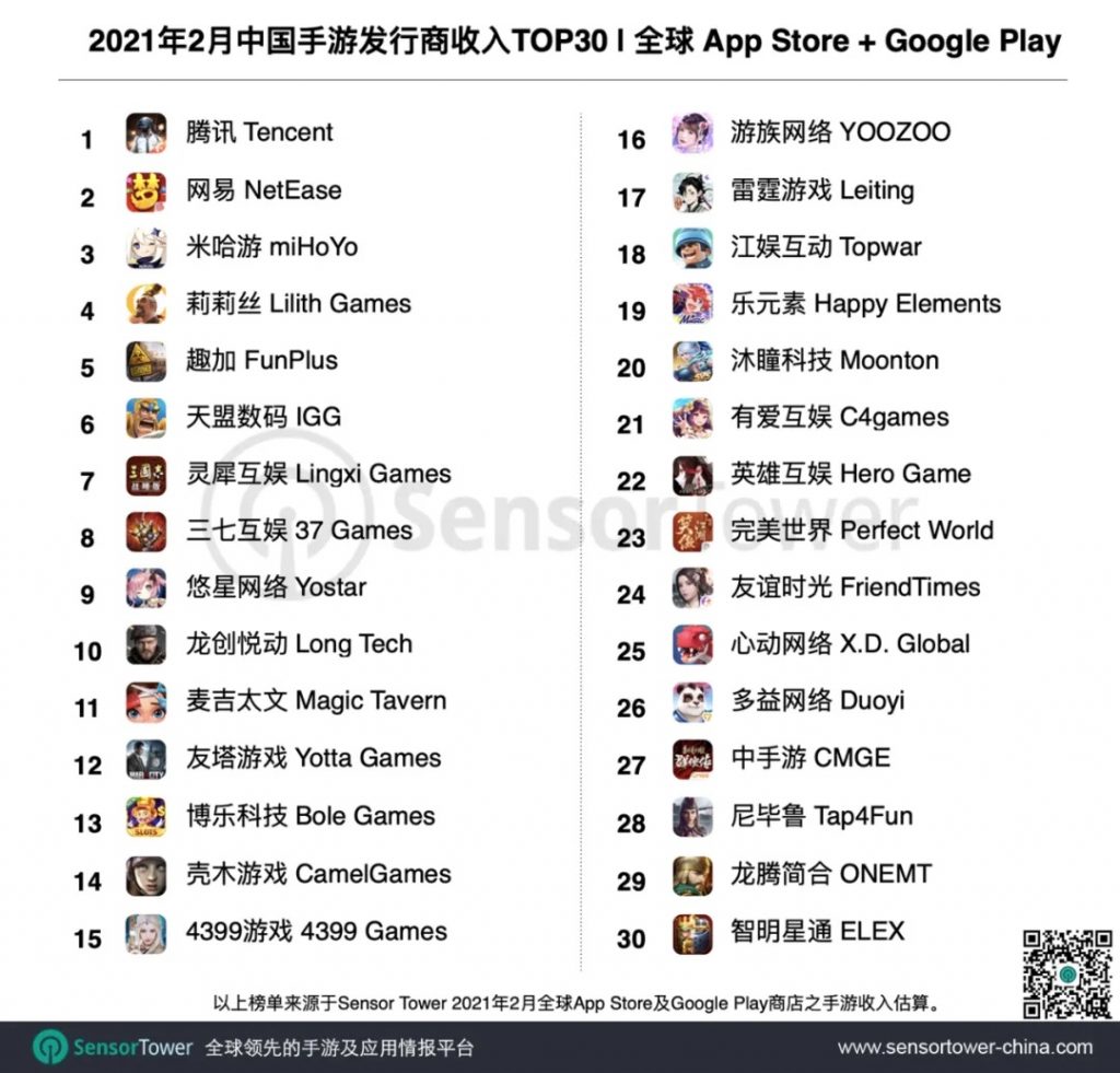 ,2021 年 2 月我国手游发行商在全球 App Store 和 Google Play 算计吸金逾越 22.4 亿美元,占全球 Top 100 手游发行商收入的 40.2%。本期共 34 家我国手游发行商入围全球手游发行商收入榜 Top 100。具体内容如下:我国手游发行商收入 Top 30