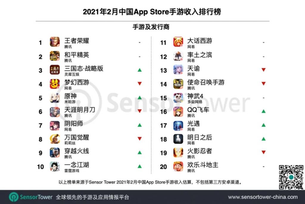 2月米哈游《原神》和《崩坏3》收入别离环比上涨6%和69%,使得发行商收入增加10%,跻身全球手游发行商收入排行榜第4名,仅次于腾讯、网易和Playrix。其间,《崩坏3》在新年版别的带动下,2月5日重回我国iPhone手游热销榜第8名。