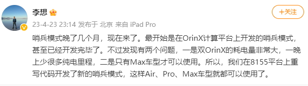 抱负轿车CEO李想4月23日晚在微博表明,岗兵形式晚了几个月。最开端是在OrinX核算平台上开发的岗兵形式,乃至现已开发结束了。不过呈现了两个问题,一是双OrinX的耗电量非常大,一晚上少许多纯电路程,二是只要Max车型才能够运用。所以该公司在8155平台上重写代码开发了新的岗兵形式,Air、Pro、Max车型都能够运用。