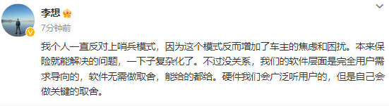 当晚早些时候,他在微博称他个人一向对立岗兵形式,以为它反而添加了车主的焦虑和困扰,不过软件层面是彻底用户需求导向,无需做取舍,能给的都给。到发稿,前一条微博已被删去。
